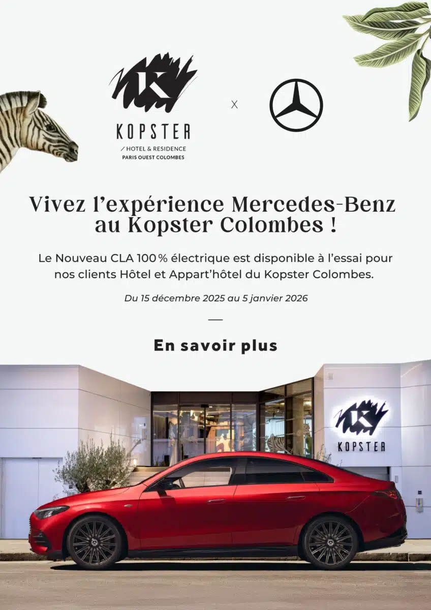 Dans nos hôtels urbains chics, Mercedes-Benz trouve naturellement sa place. Chaque espace de Kopster est pensé comme un lieu où design, confort et convivialité se rencontrent. Nos atmosphères modernes et élégantes créent un cadre parfait pour mettre en lumière le Nouveau CLA 100 % électrique disponible à l’essai pour nos clients Hôtel et Appart’hôtel  au Kopster Colombes du 15 décembre 2025 au 5 janvier 2026.